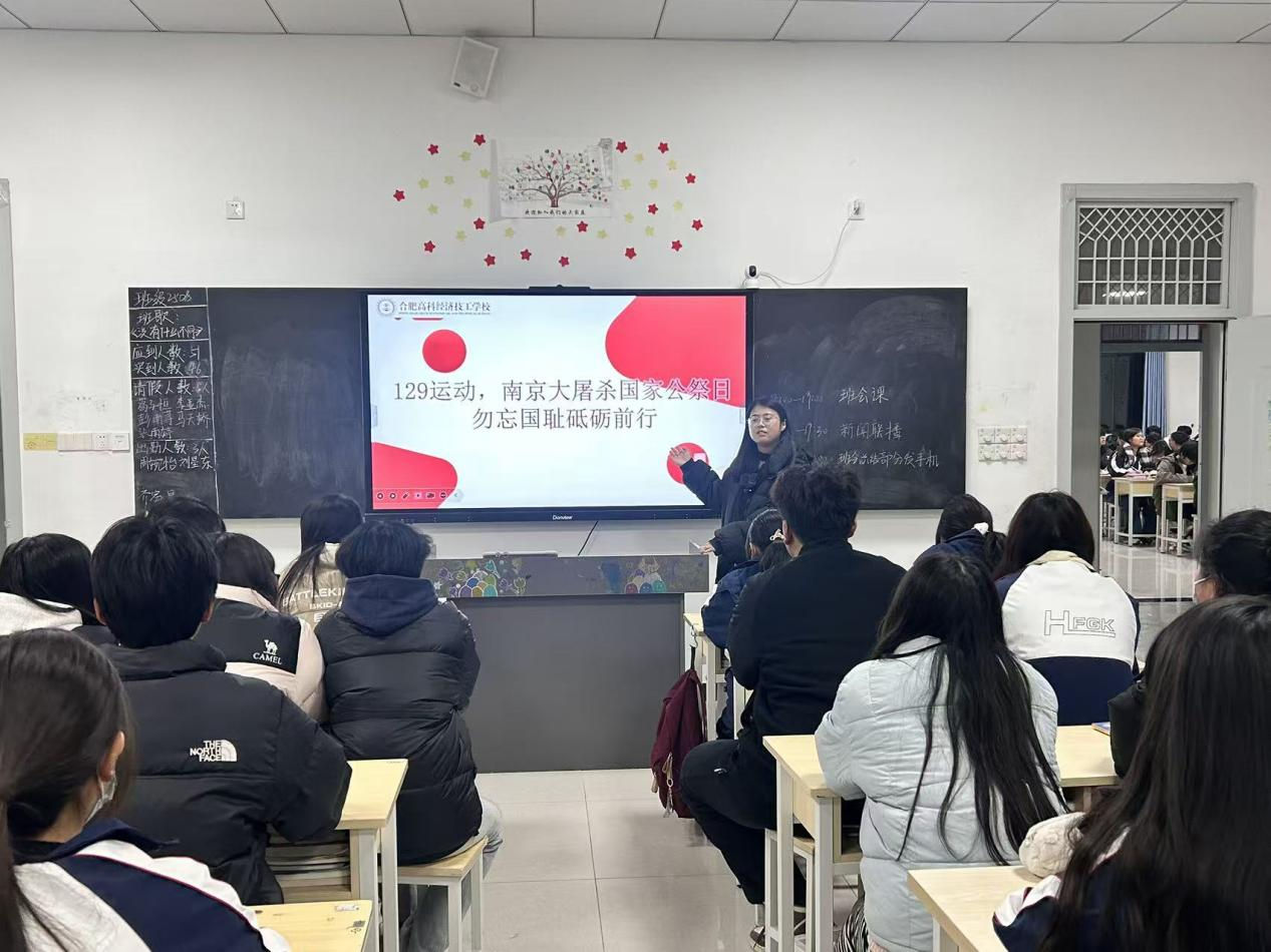 班会上,班主任们通过课件、历史影像与翔实史料,带领同学们重温那段刻骨铭心的历史。在一二·九运动主题分享中,大家深入了解1935年北平学子冲破军警封锁、高呼“停止内战,一致对外”的爱国壮举,深刻体会青年一代在民族危亡之际挺身而出的责任与担当;在国家公祭日相关讲解中,30万同胞惨遭屠戮的沉痛史实通过幸存者口述、罪证影像等资料直观呈现,让同学们真切感受南京大屠杀的残酷真相,深刻理解国家公祭日铭记历史、缅怀逝者、谴责暴行、捍卫和平的核心意义。